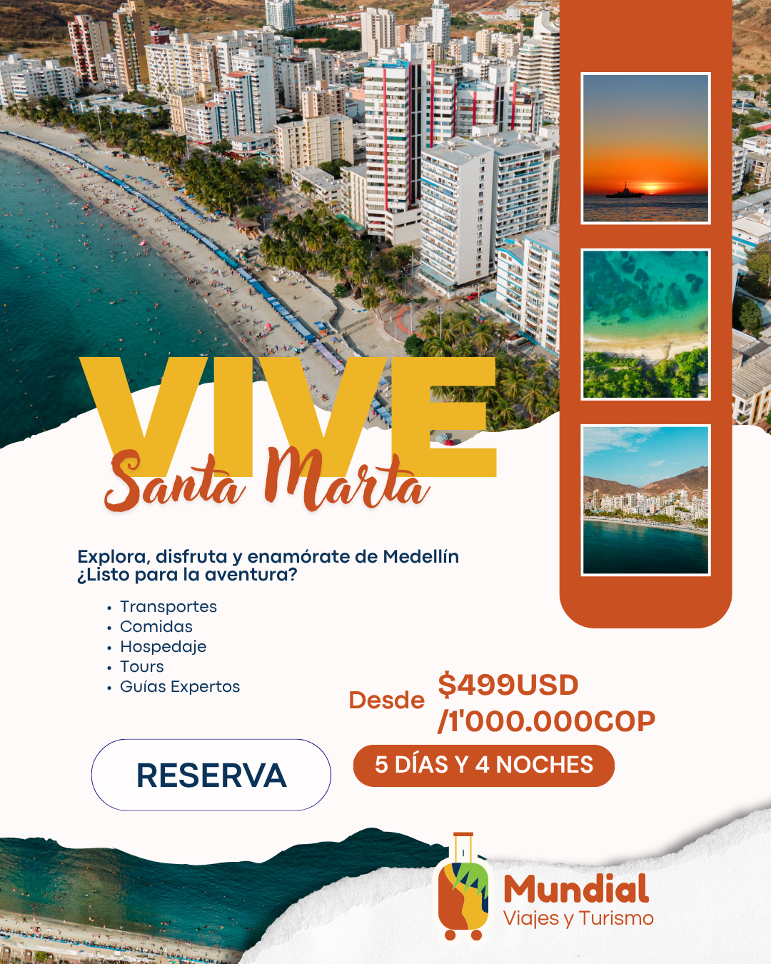 En Mundial creemos que viajar es descubrir el mundo con responsabilidad y corazón. Por eso creamos experiencias todo incluido a los destinos más bellos de Colombia y el mundo, combinando comodidad, autenticidad y sostenibilidad. Cada viaje se diseña a tu medida para que vivas momentos únicos mientras apoyas el turismo sostenible, cuidando la naturaleza y las culturas que visitas. Con Mundial Agencia de viajes, cada destino se convierte en una historia que deja huella… pero una huella verde. 🌿✈️